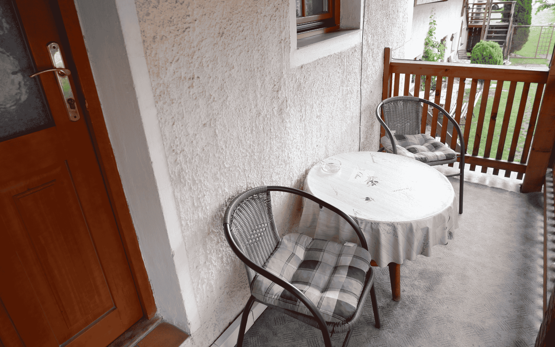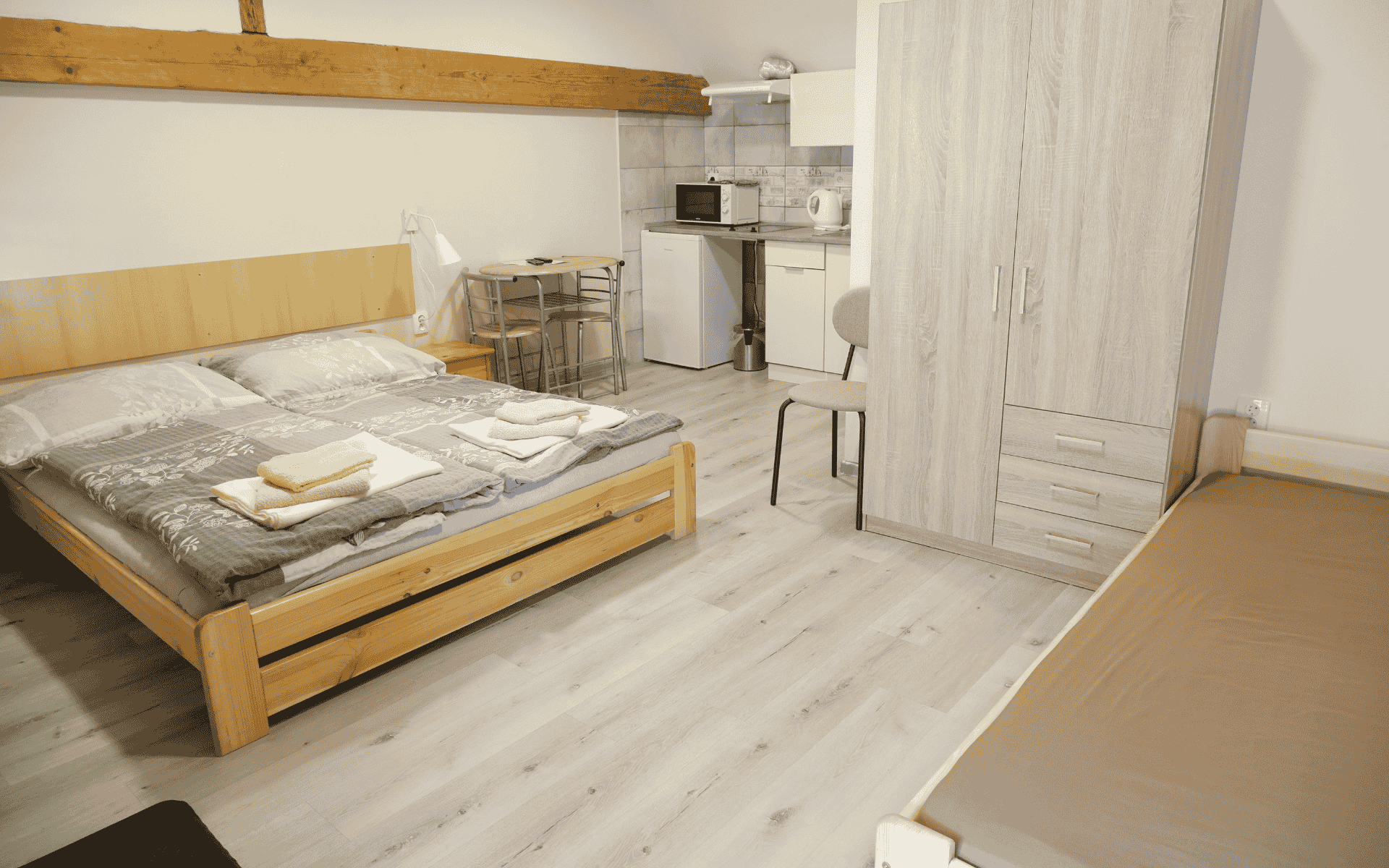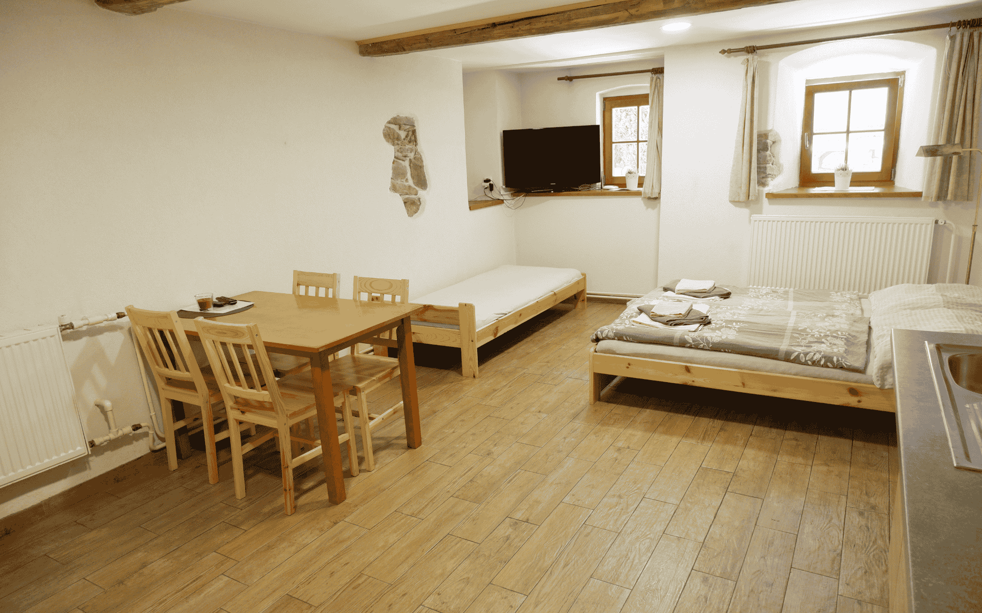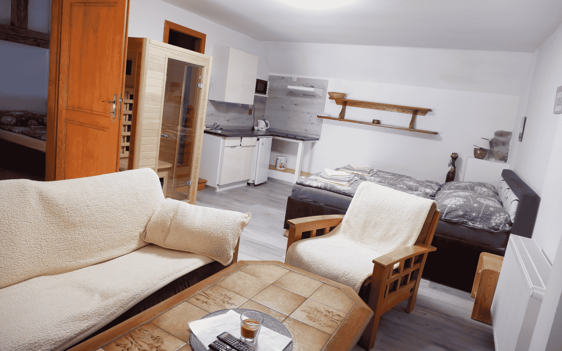 Tento čtyřlůžkový apartmán se nachází v prvním podlaží budovy a má vlastní pavlač s venkovním posezením. V hlavní místnosti se nachází manželská postel, přistýlka, kuchyňský kout, pohovka a TV. V druhé místnosti jsou dvě samostatná lůžka a součástí apartmánu je také koupelna se sprchovým koutem a infra saunou, kterou lze využít za 300,- Kč/den.