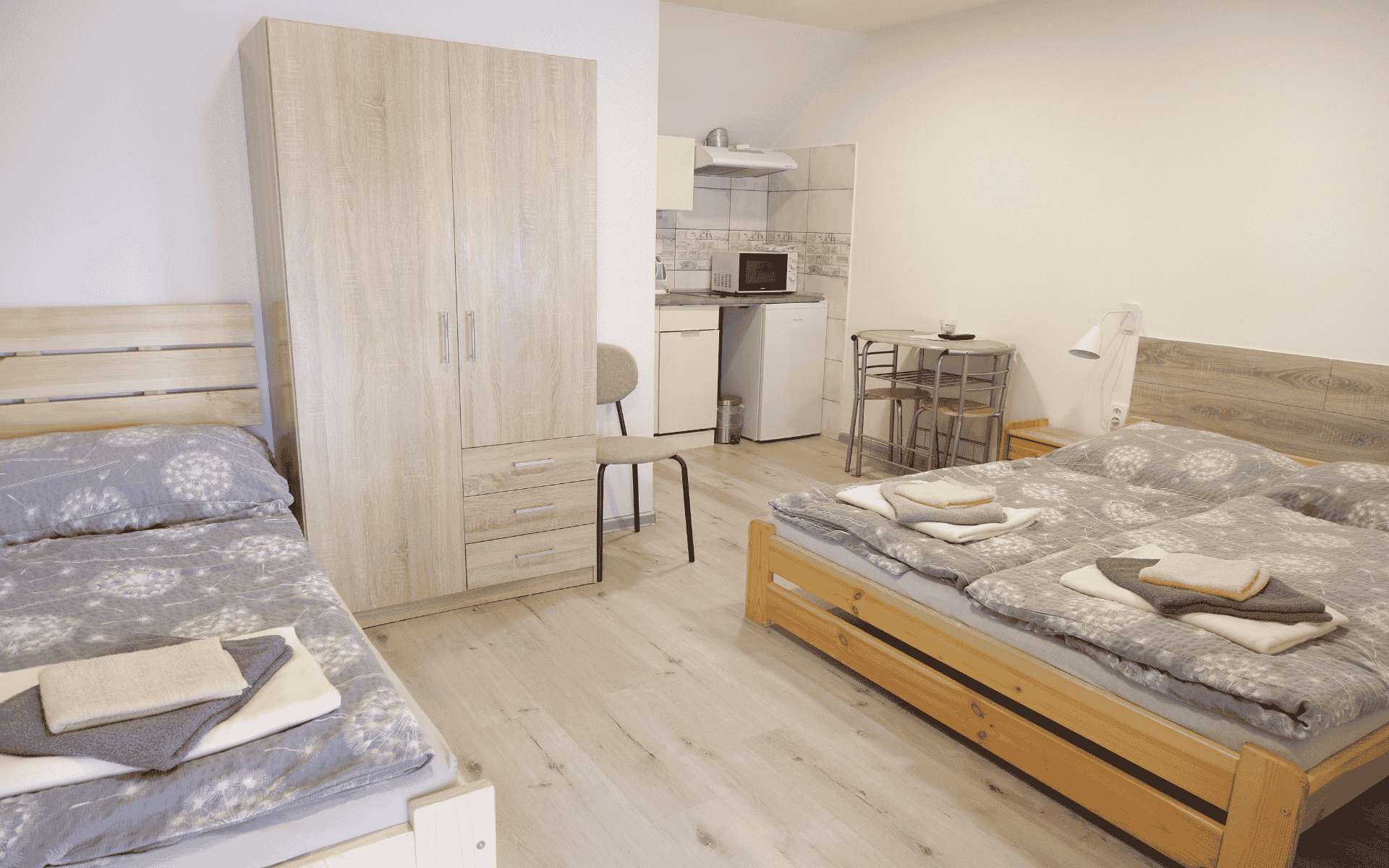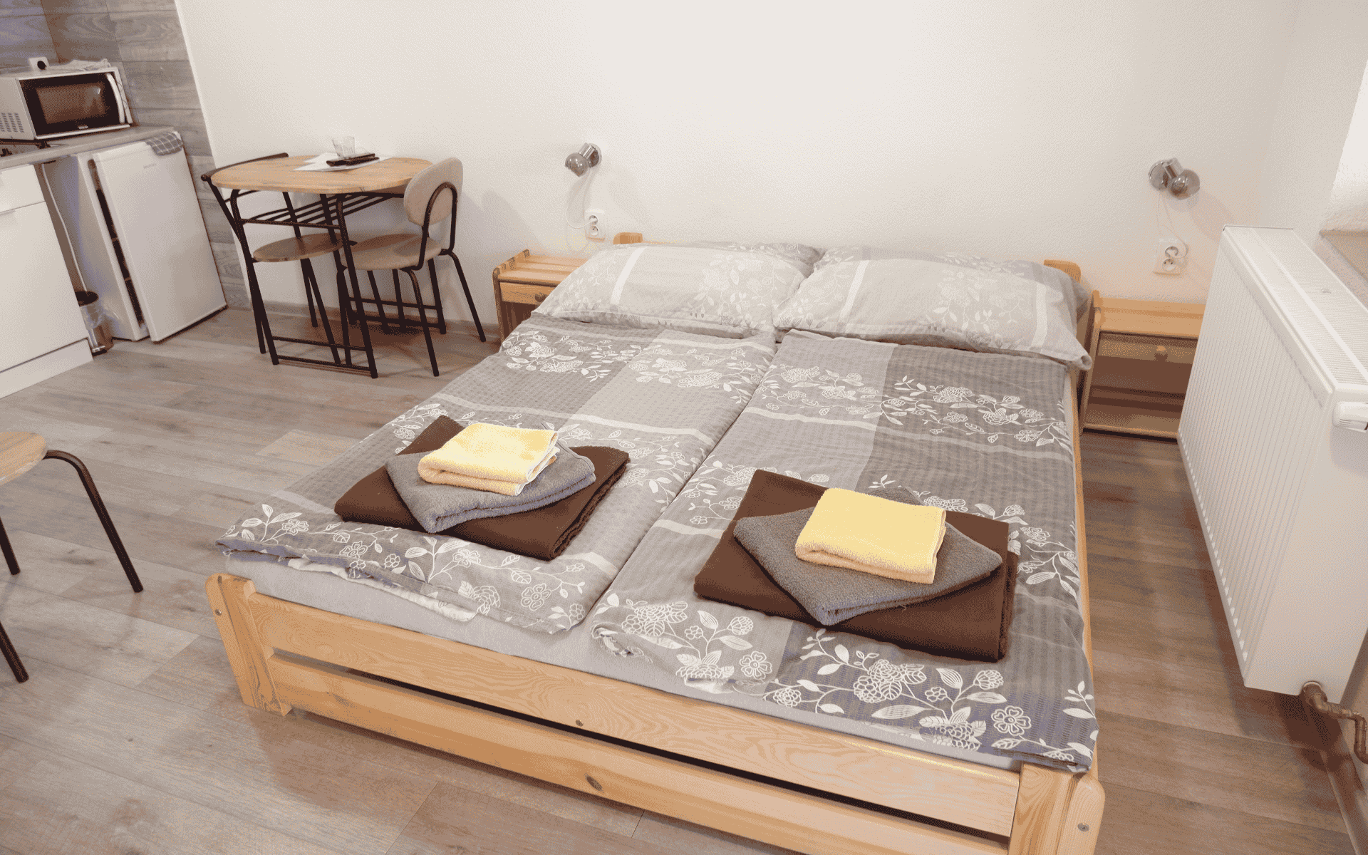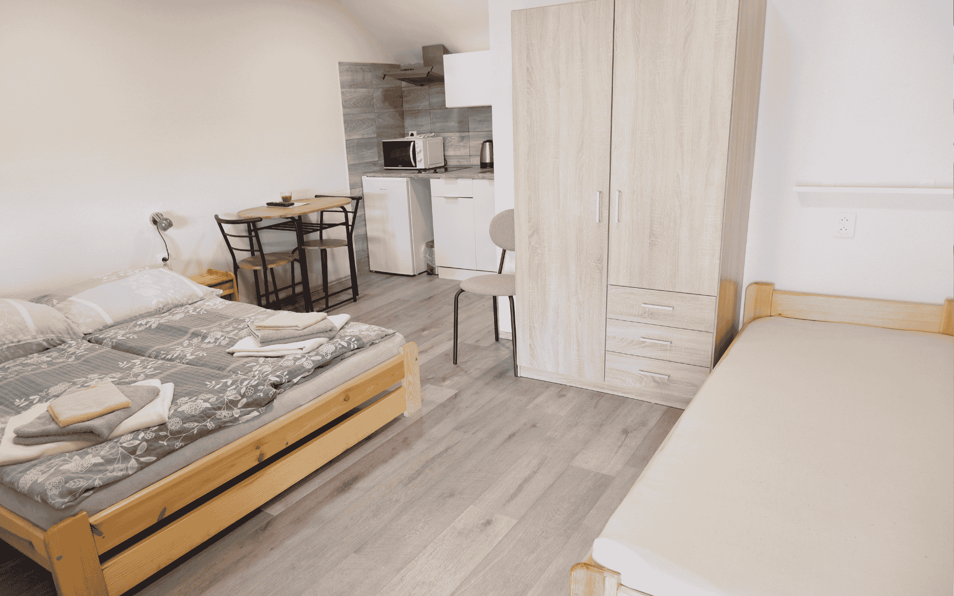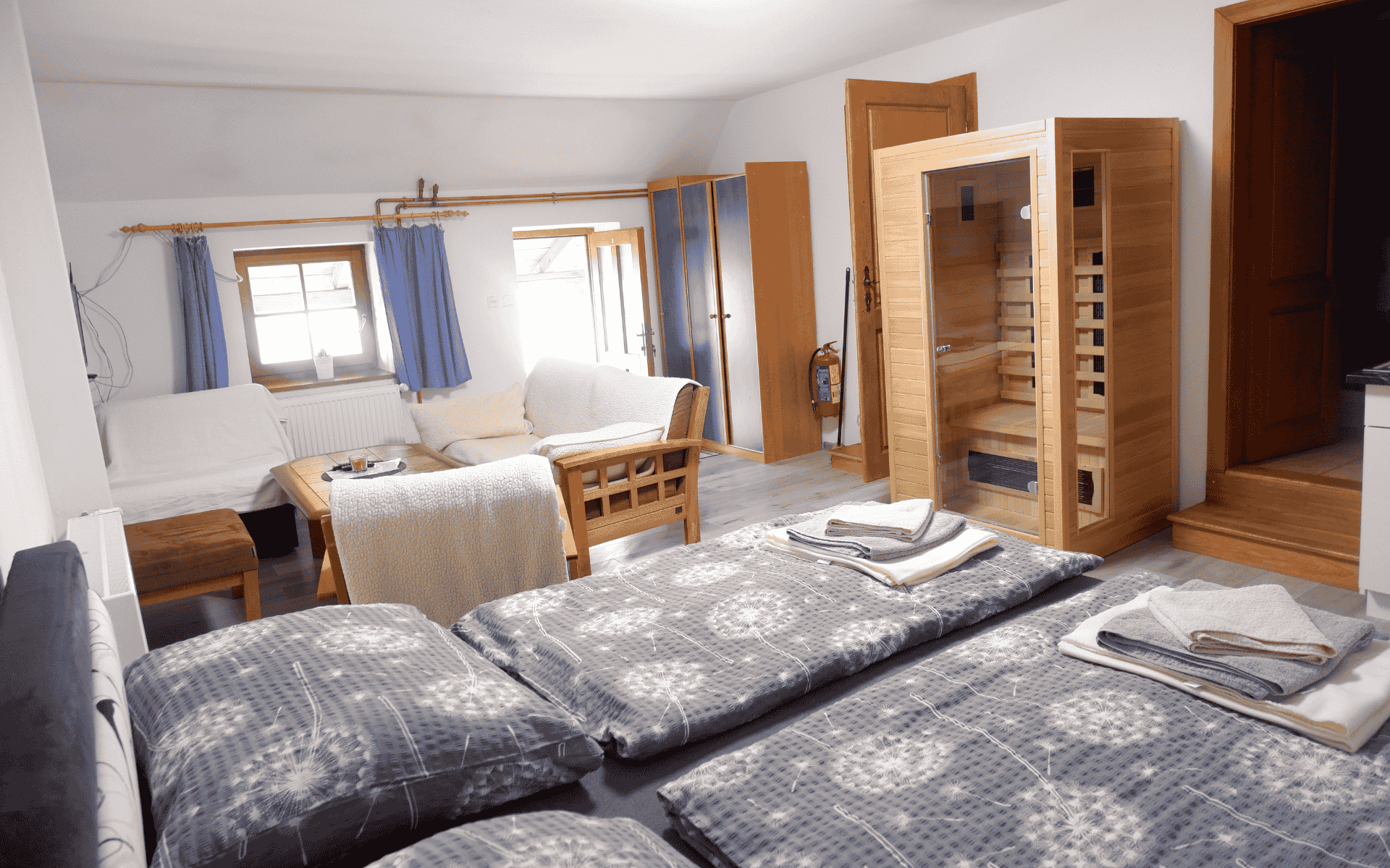 Tento čtyřlůžkový apartmán se nachází v prvním podlaží budovy a má vlastní pavlač s venkovním posezením. V hlavní místnosti se nachází manželská postel, přistýlka, kuchyňský kout, pohovka a TV. V druhé místnosti jsou dvě samostatná lůžka a součástí apartmánu je také koupelna se sprchovým koutem a infra saunou, kterou lze využít za 300,- Kč/den.
