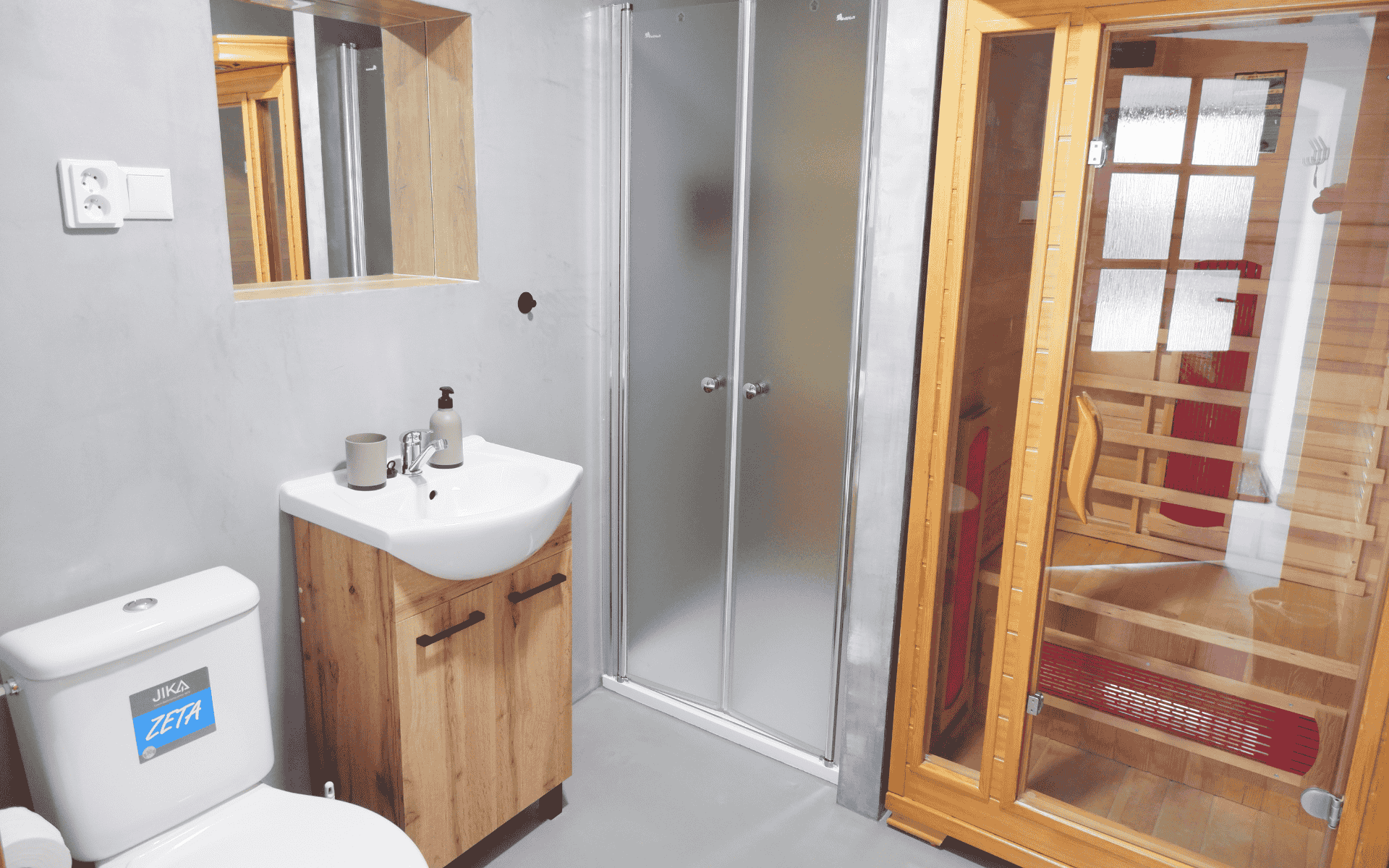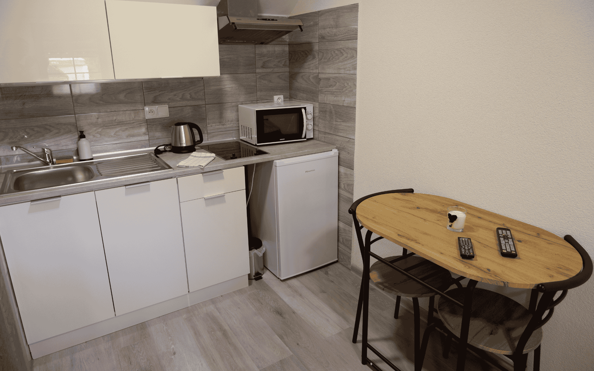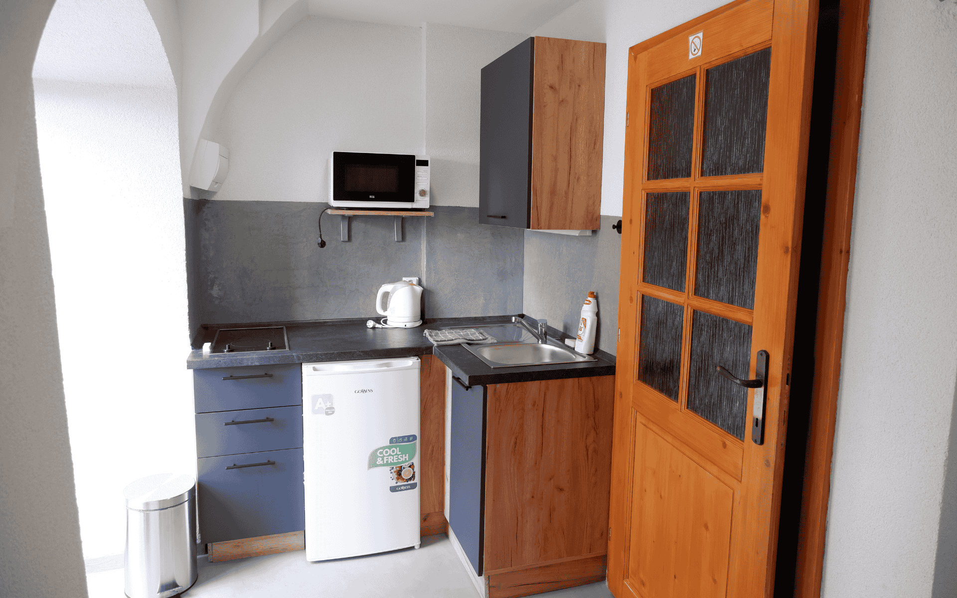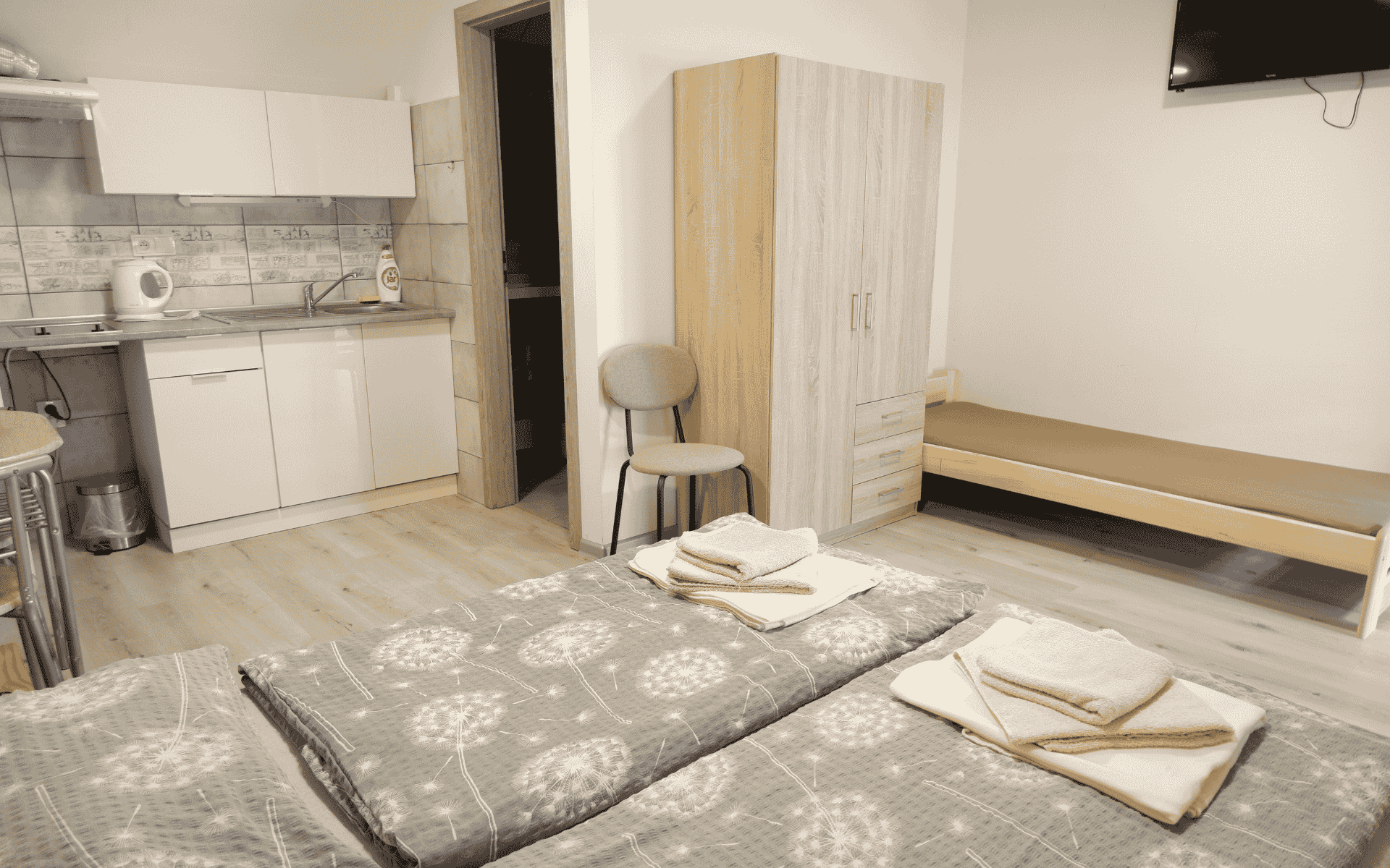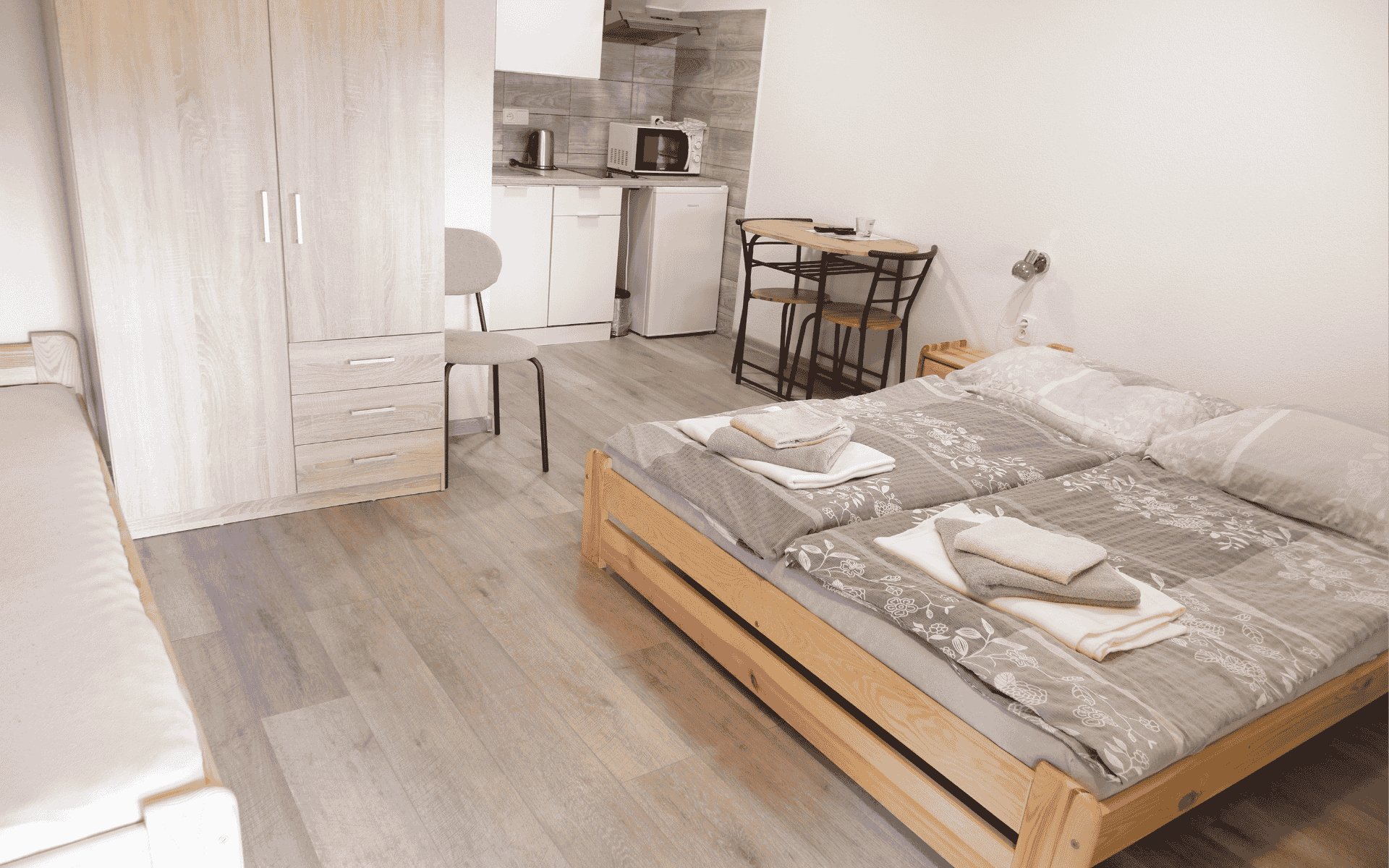 Tento čtyřlůžkový apartmán se nachází v prvním podlaží budovy a má vlastní pavlač s venkovním posezením. V hlavní místnosti se nachází manželská postel, přistýlka, kuchyňský kout, pohovka a TV. V druhé místnosti jsou dvě samostatná lůžka a součástí apartmánu je také koupelna se sprchovým koutem a infra saunou, kterou lze využít za 300,- Kč/den.