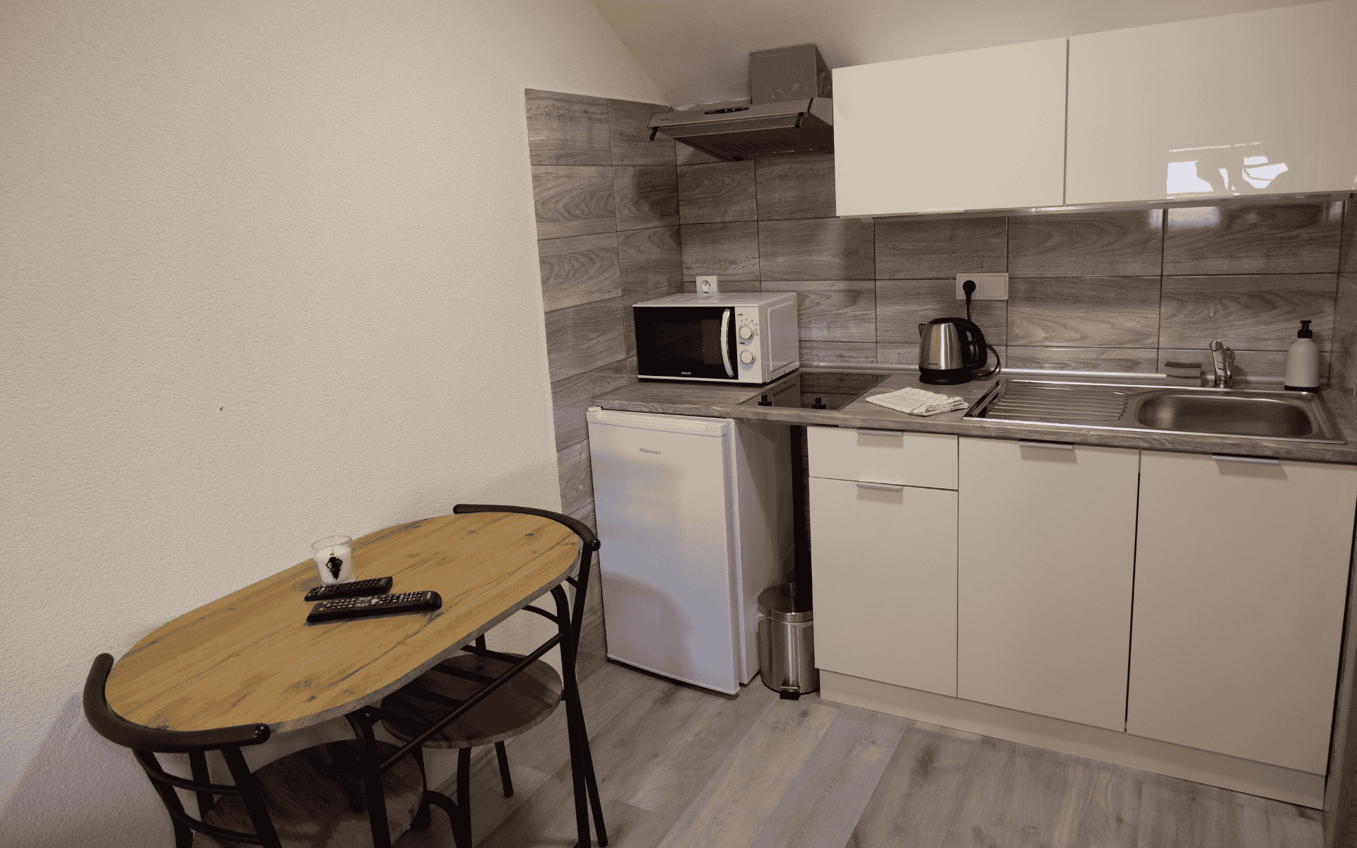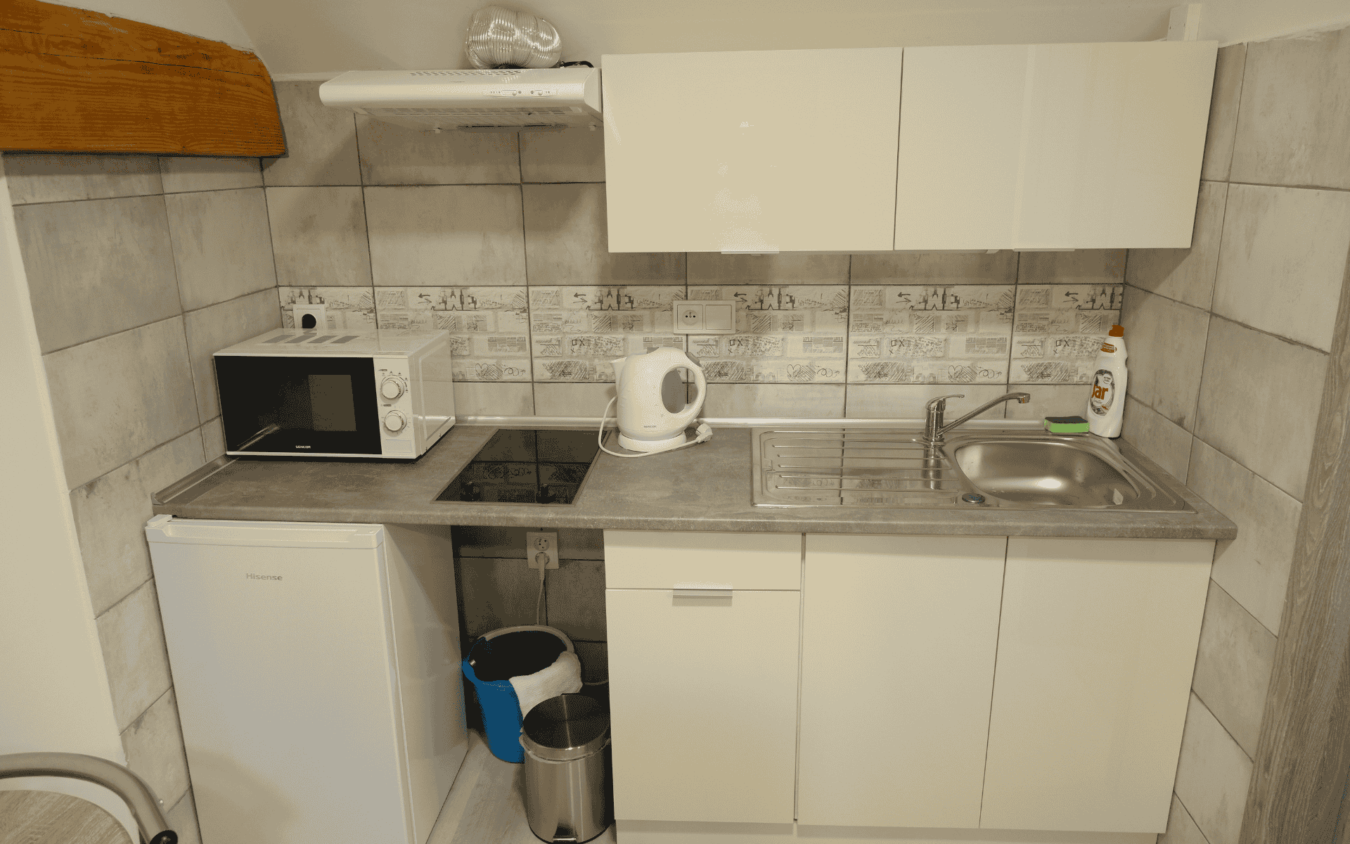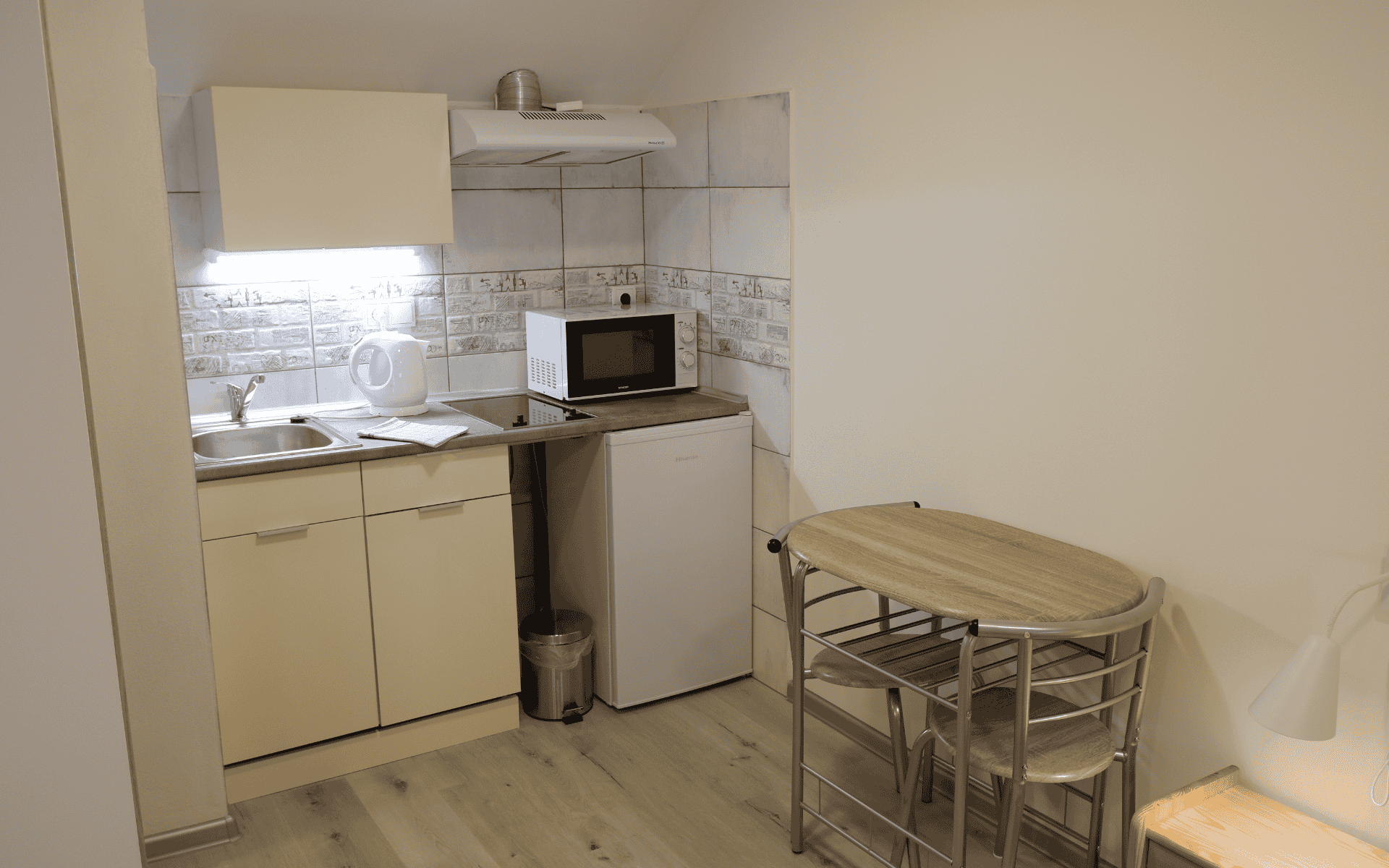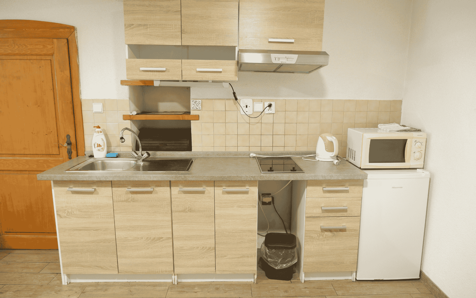 Tento čtyřlůžkový apartmán se nachází v prvním podlaží budovy a má vlastní pavlač s venkovním posezením. V hlavní místnosti se nachází manželská postel, přistýlka, kuchyňský kout, pohovka a TV. V druhé místnosti jsou dvě samostatná lůžka a součástí apartmánu je také koupelna se sprchovým koutem a infra saunou, kterou lze využít za 300,- Kč/den.